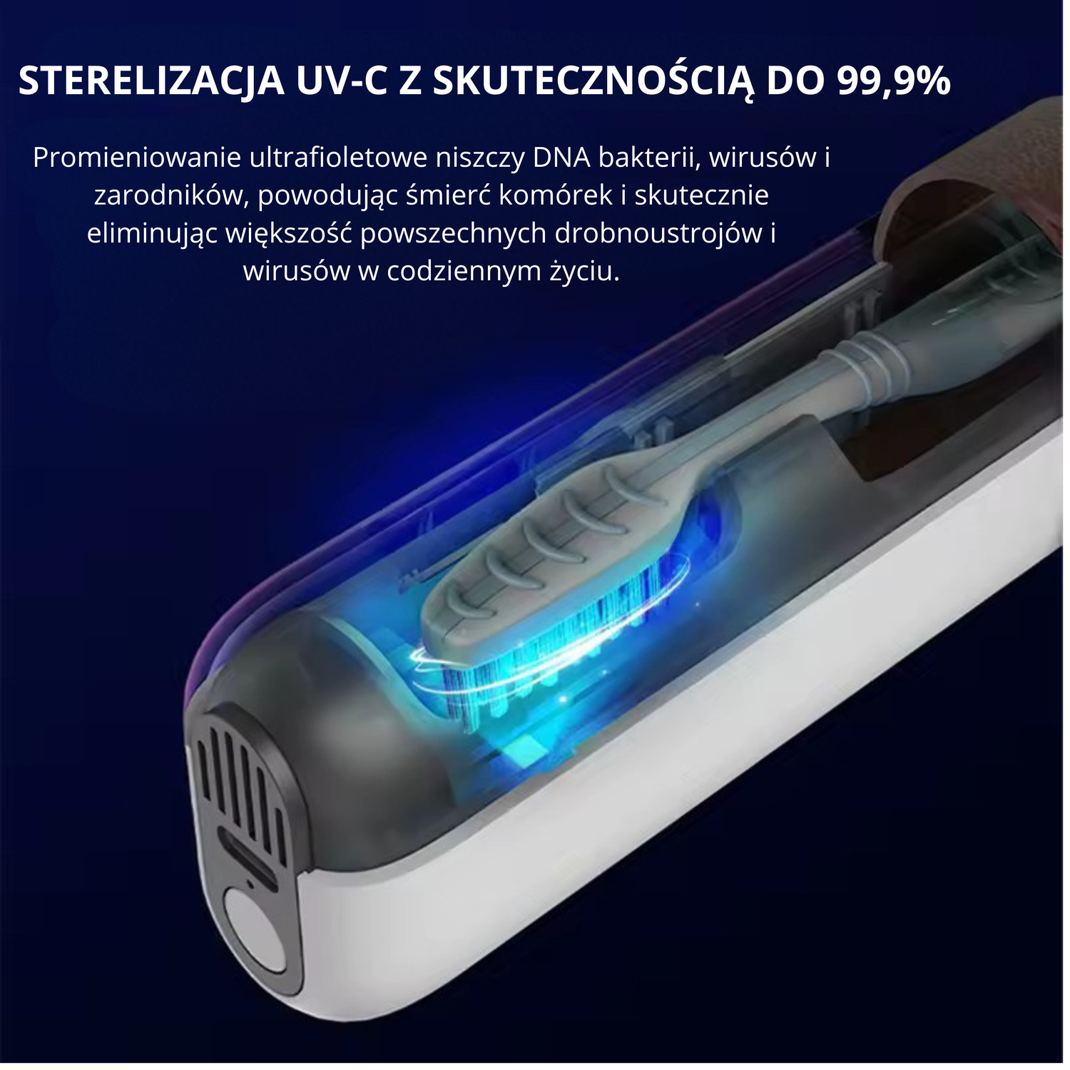 Tak – używa certyfikowanego światła UVC-LED. To ta sama technologia co w szpitalach i laboratoriach. Testy niezależne potwierdzają skuteczność 99,9% przeciwko E.coli, gronkowcom i pleśni.